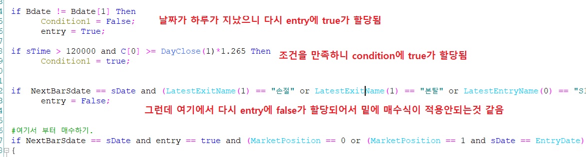 위 내용에서 entry = True;는 if문에 포함되는 내용이 아닙니다.