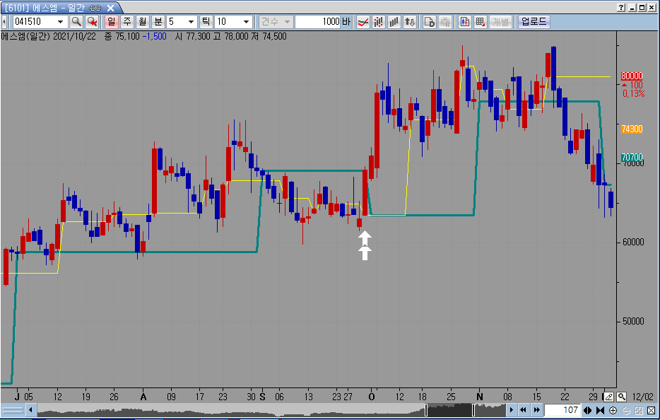 첨부한 파일에 하얀화살표를 가리키는 봉이 에스엠 2021년 9월 30일봉으로 9월의 마지막 거래일 일봉입니다. 녹색은 전월 종가 또는 시가를 그려주는 선입니다.