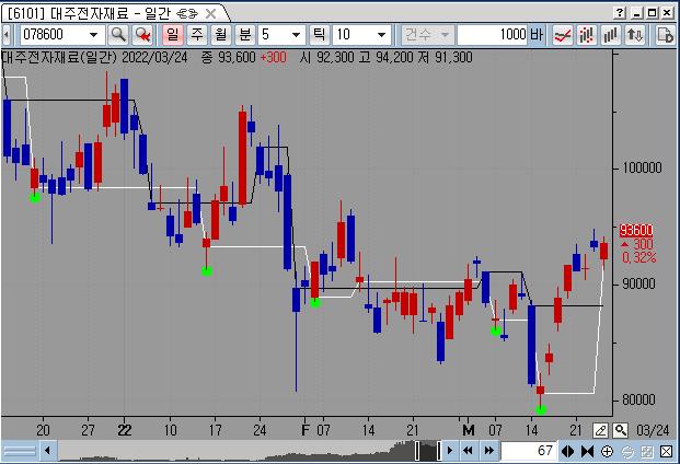 첨부한 대주전자재료 차트에 그려지는 선이 일정한 간격을 유지하면서 변하는게 아니라