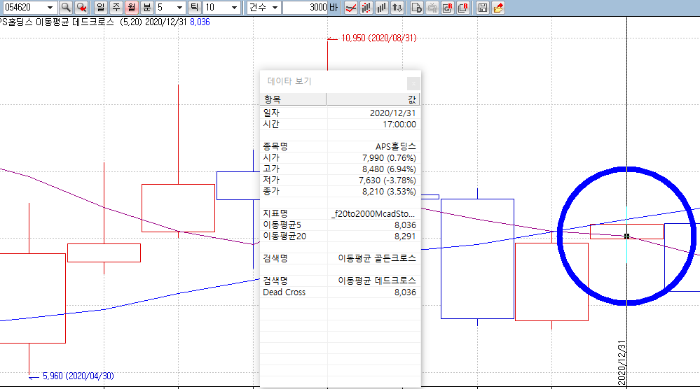 월봉상(data4) 20년 12월에 데드코로스가 났던 것을 수식으로 나타내고싶은데요.(그림 4-1)