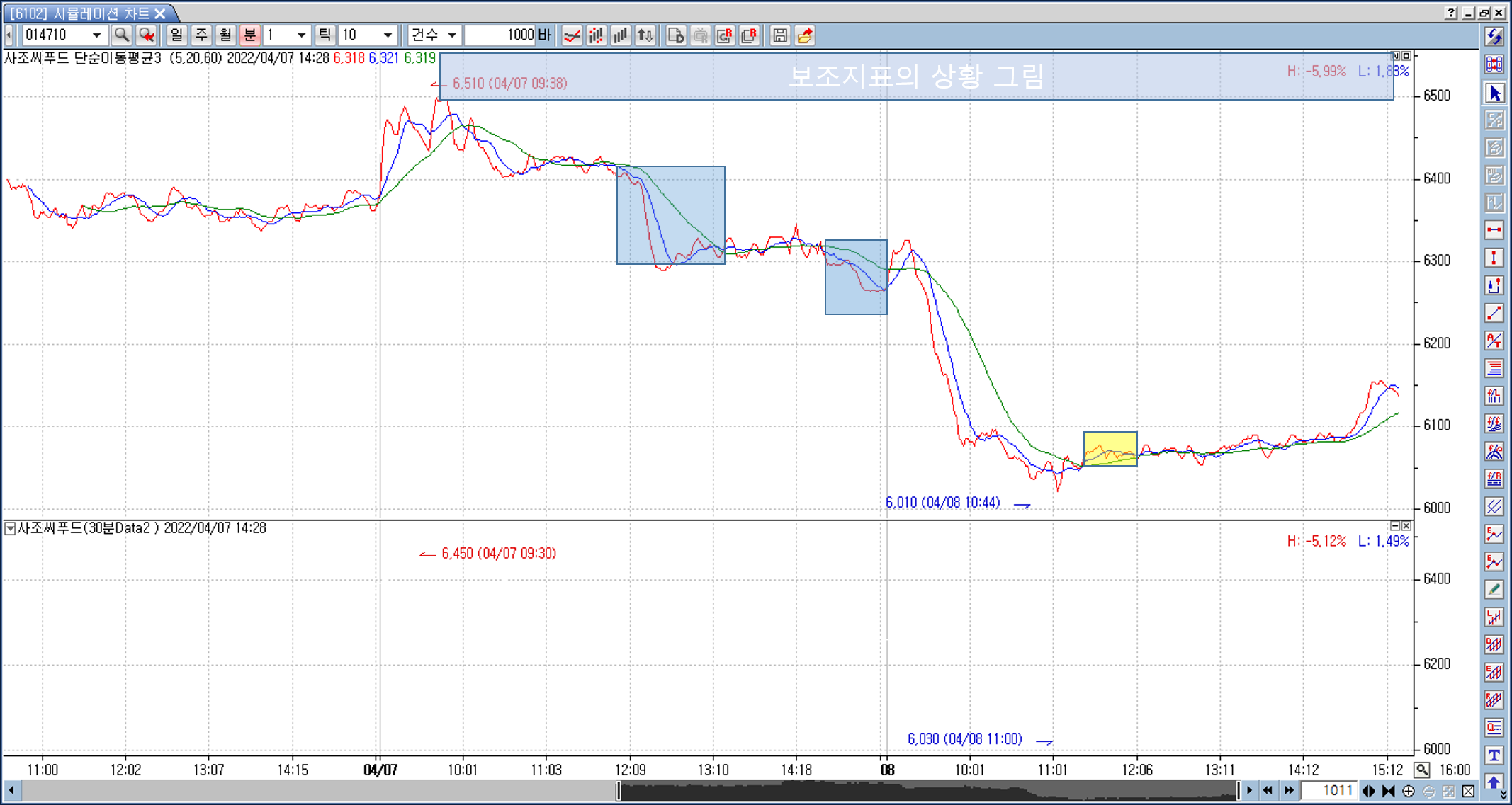 본챠트는 1분봉(5/20/60 이평) 타주기 챠트에는 10분봉(5/20/60 이평)이 있습니다.