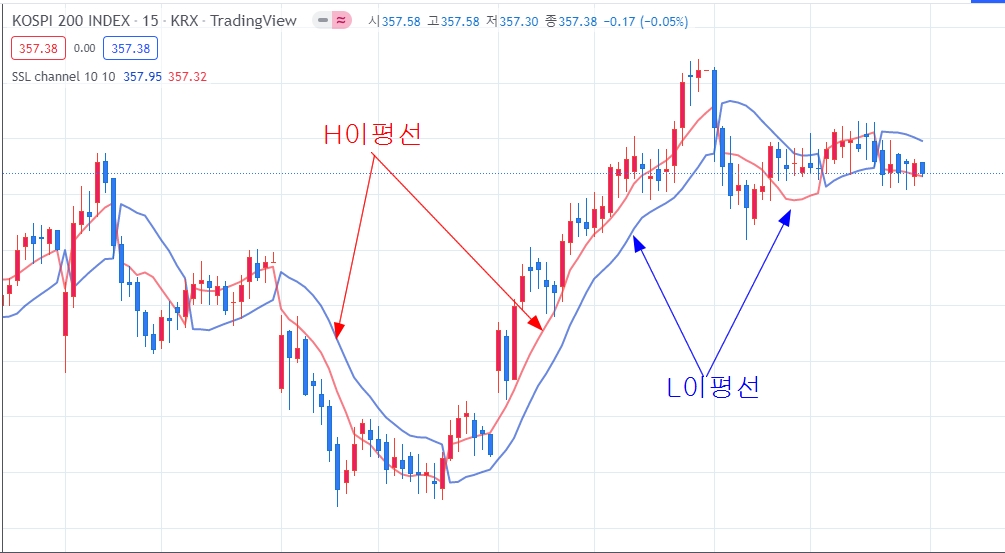 위의 H이평선을 캔들이 상향돌파시 H이평선=적색 / L이평선=청색으로 표시하고