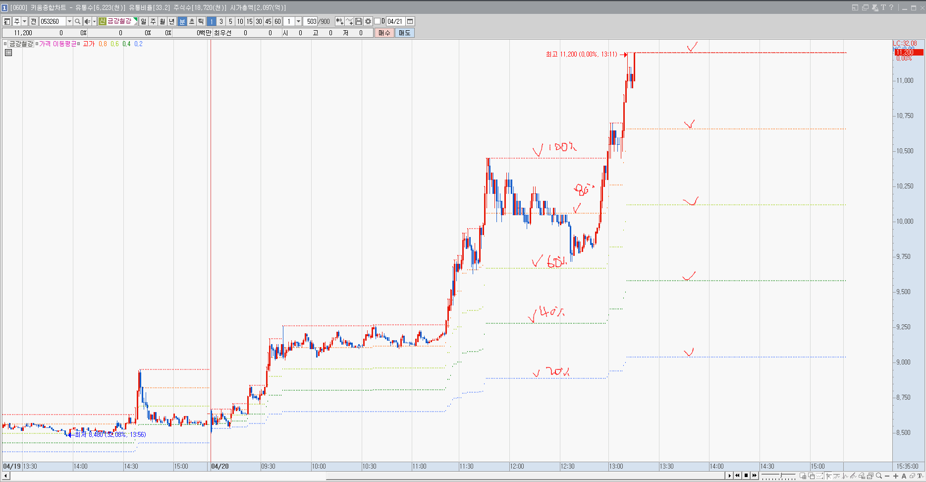 1.당일 최고가 부터 (당일 최저가 or 전일 종가)의 크기를 100%를 기준으로,