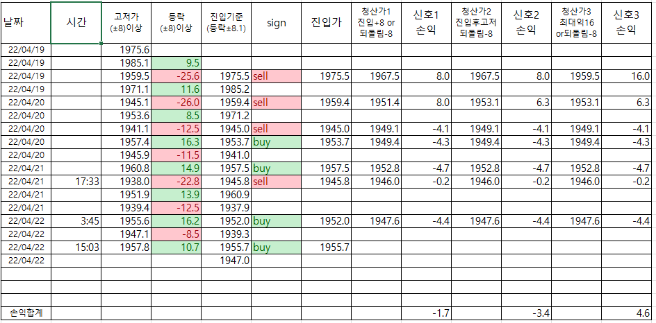 첨부파일 셋째 행에서 4.19일 전저점대비로 기준등락(8.0)보다 약간 큰 9.5가 올라 1985.1 이 되었고, 이후 25.6 하락하여 1959.5 가 되는데, 이 하락시 이전 상승폭보다 0.1만큼 더 하락한 지점인 1975.5(직전 고점대비 9.6 하락)에서 즉시 매도 진입..