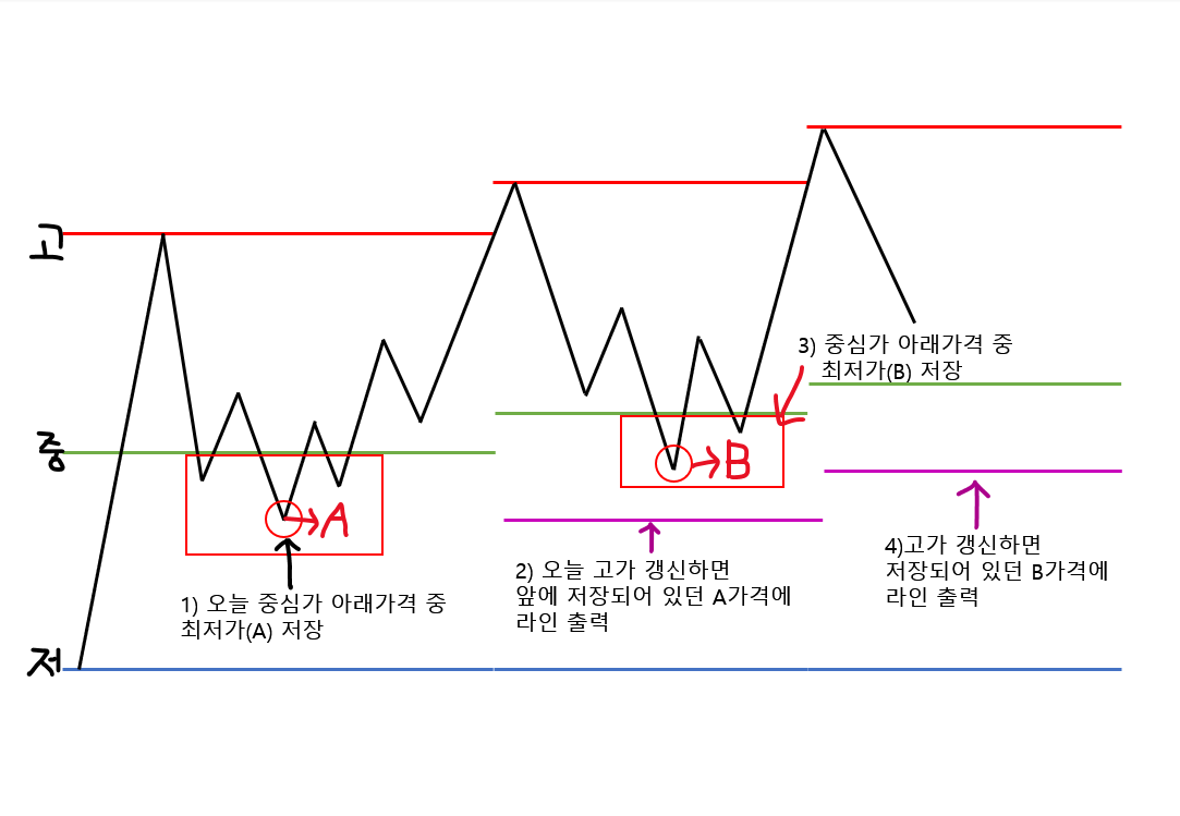 2) 오늘의 고점이 갱신되면 1)에서 저장되었던 가격(A)의 선을 출력합니다