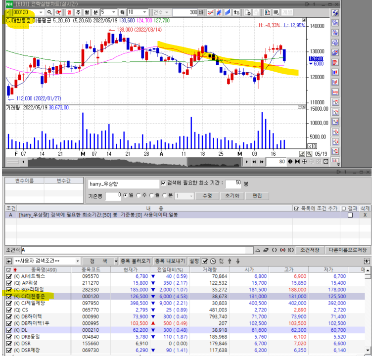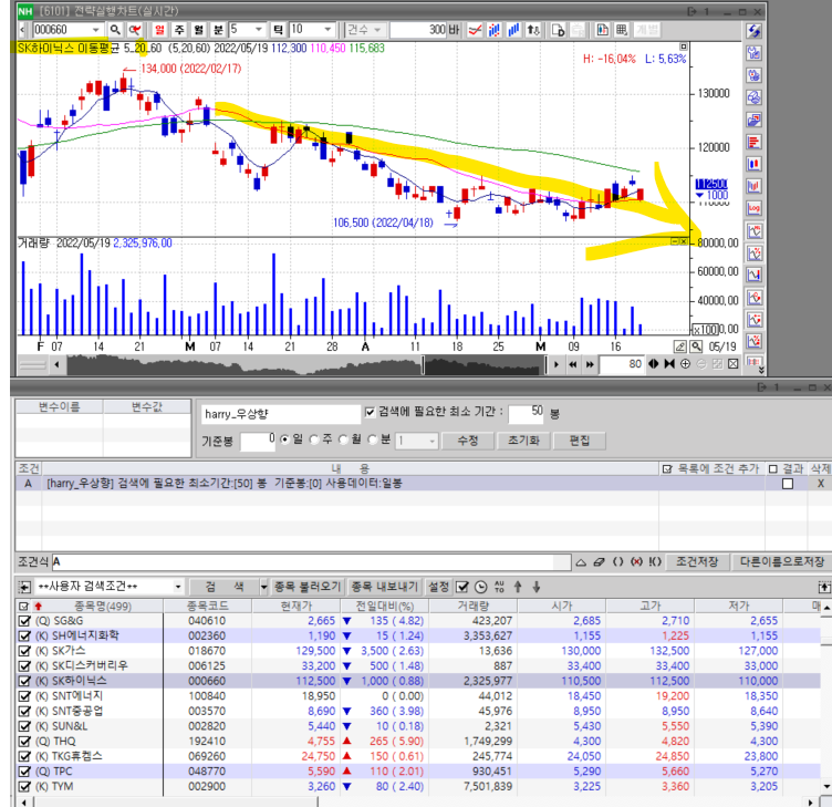 위 식으로 구해진 종목들중 우상향이 아니고 우하향인 종목(예:CJ대한통운, SK하이닉스등) 차트 캡춰올렸으니 참고하여 답변주시면 감사하겠습니다.