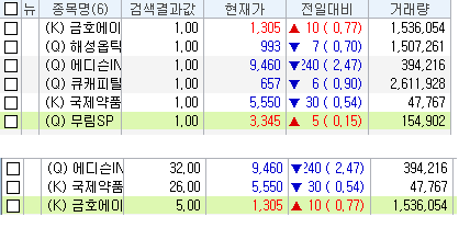 실제로 검색된 종목은 에디슨INNO, 국제약품, 금호에이치티밖에 검색되지 않았고