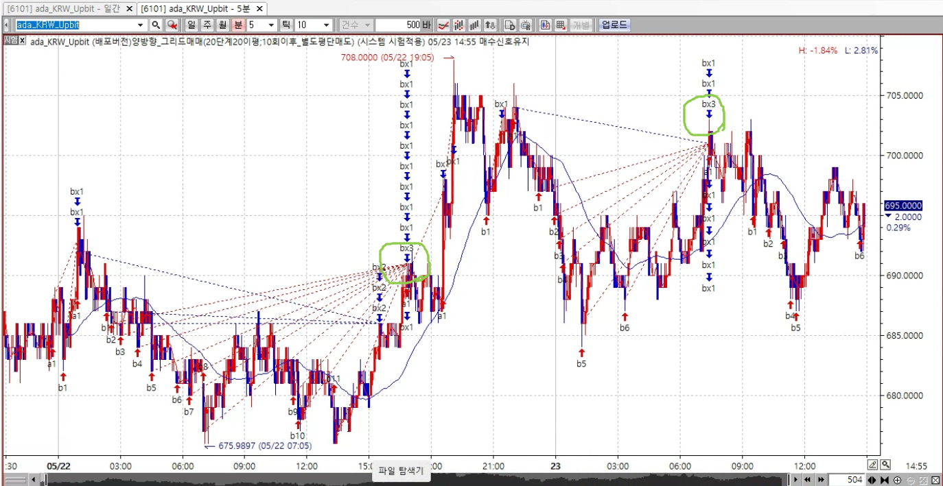 1. 첨부한 캡쳐 사진 처럼 통합챠트에 bx3가 안나와도 될 위치에서 다른 종목들도 그렇고 bx1의 신호가 나올때 bx3가 섞여서 나옵니다.(어떤종목은 10회이하 분할 매수시에도 bx3가나오고, 어떤종목은 10회 이하에서는 bx1만 나올 때도 있고 그렇습니다.