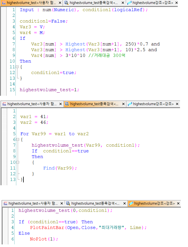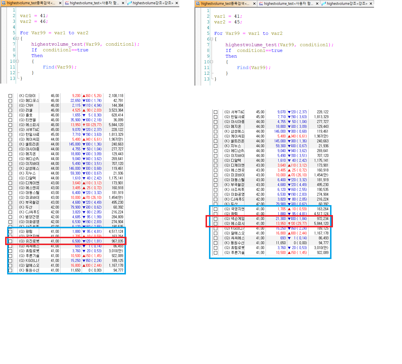 똑같이 highestvolume_test(0,condition1); 을 사용했음에도 종목검색 결과의 경우