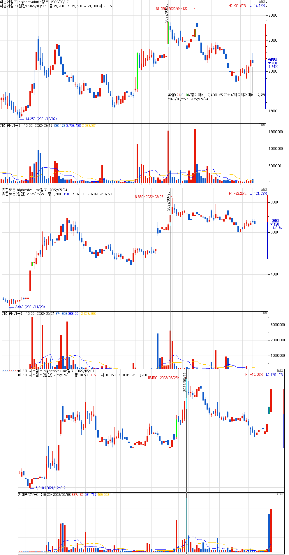 조건에 부합되지 않는 유진로봇, 에스피시스템스와 같은 종목이 나왔습니다.