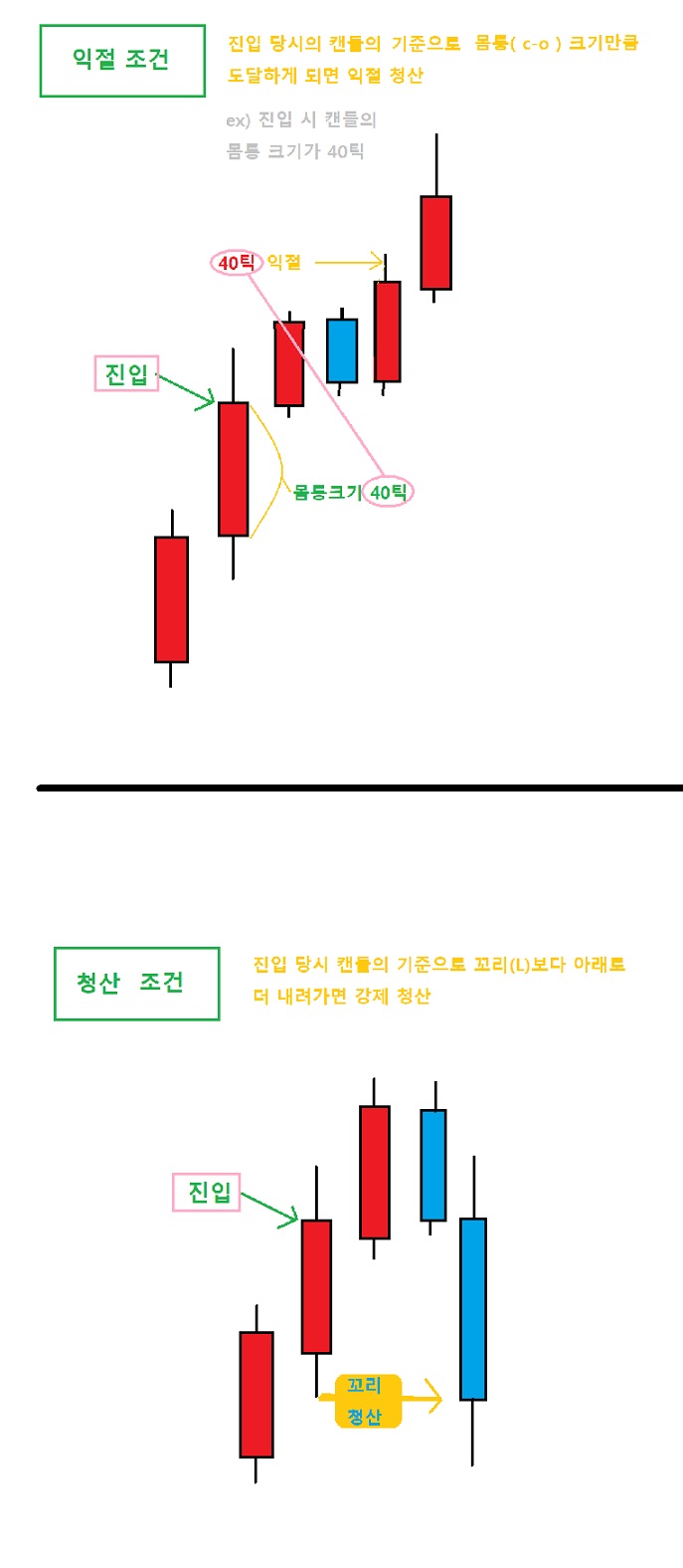 3. 매수 당시에 그때 그 양봉 캔들의 기준으로 몸통크기 만큼 올라가면 익절!