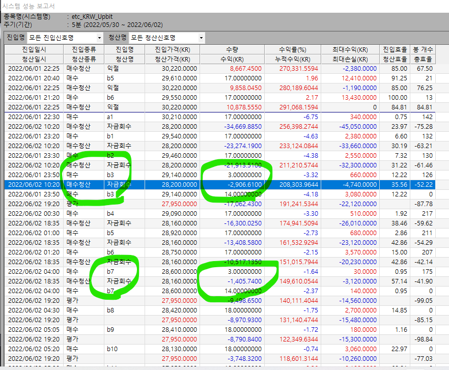 이렇게 차감시켜 각 진입별로 수량이 얼마에 청산되어 손익이 얼마나 되는지 리포트가 생성이 됩니다.