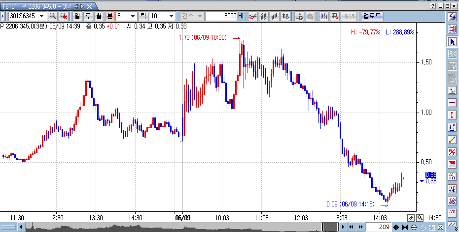KP200선물연결 챠트에 옵션 등가, 2.5point차이의 행사가, 1.25point등가 변경선을 표시하고