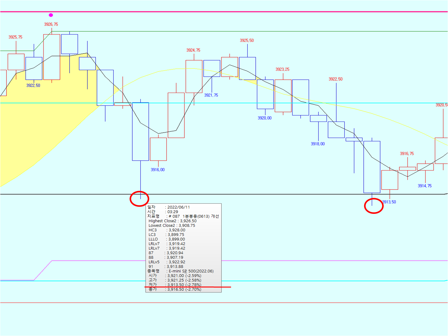 즉 그림 처럼 3913.50 봉에 찍혀야 하는데 (옆 봉보다 더 낮은 가격)