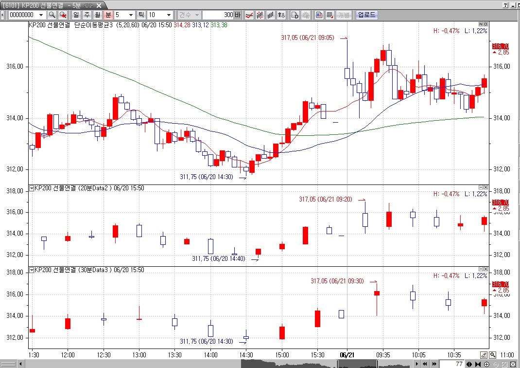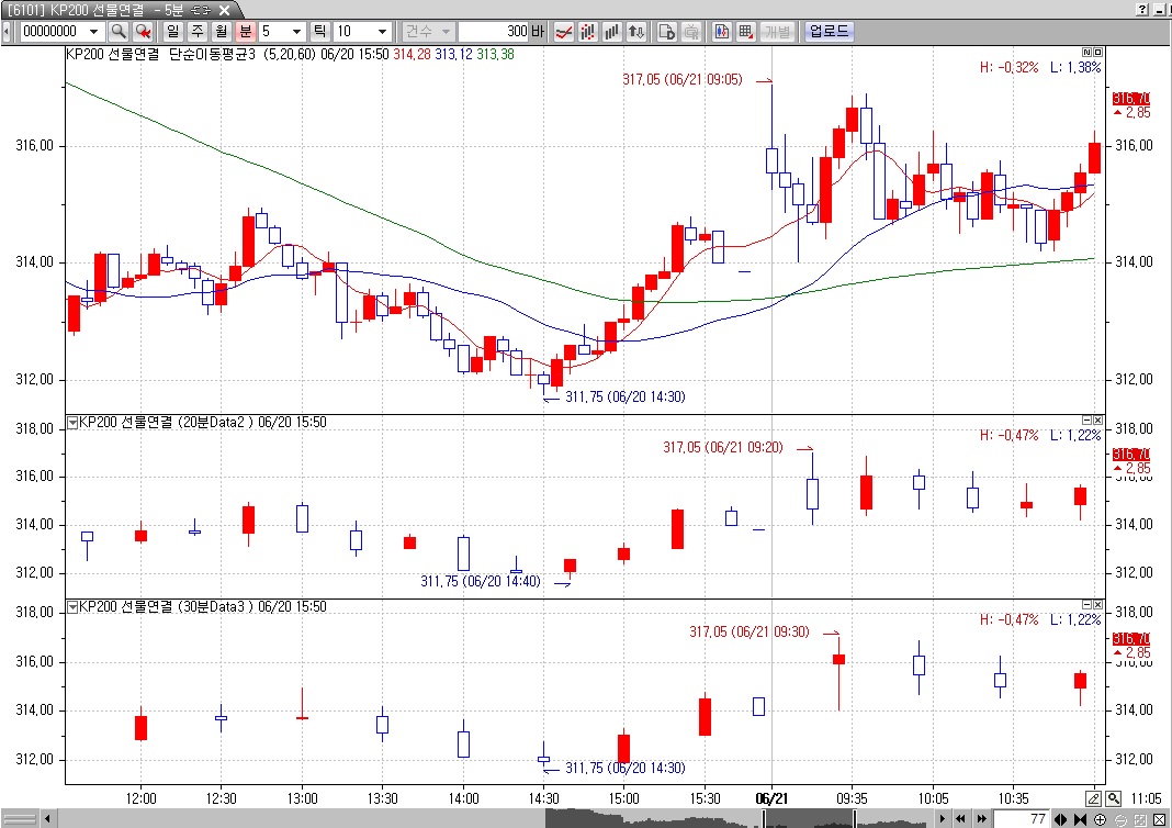 밑에 첨부한 그림처럼 선물 5분봉 밑에 20분봉, 30분봉을 포개서 보고 있습니다~