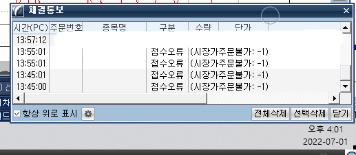 > 장중에 스팟에서 옵션 주문을 냈는데 저런 첨부 그림과 같은 오류가 뜹니다.