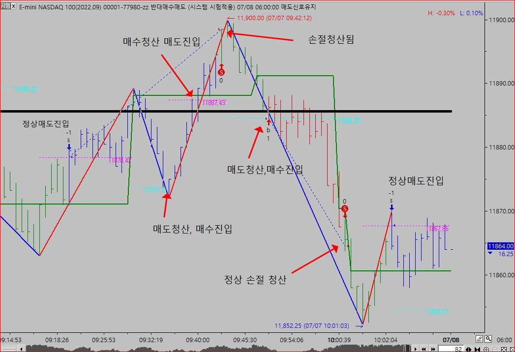 하락전환값에 도달하면 매수진입, 상승전환값에 도달하면 매도진입입니다.