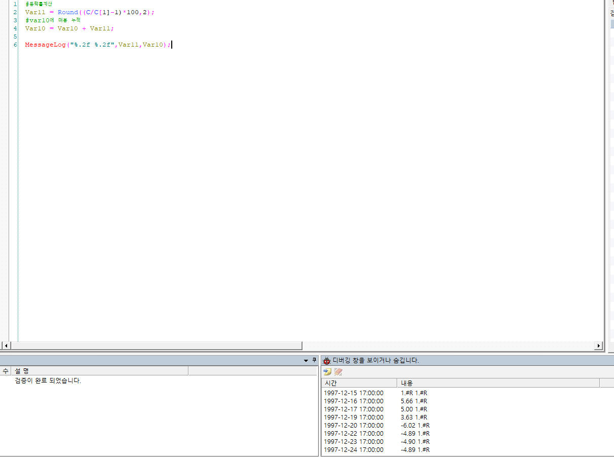 수식이 차트에 적용되면 항상 첫봉부터 마지막봉으로 계산해서 오는 것을 감안하시고 식을 작성하시면 됩니다.