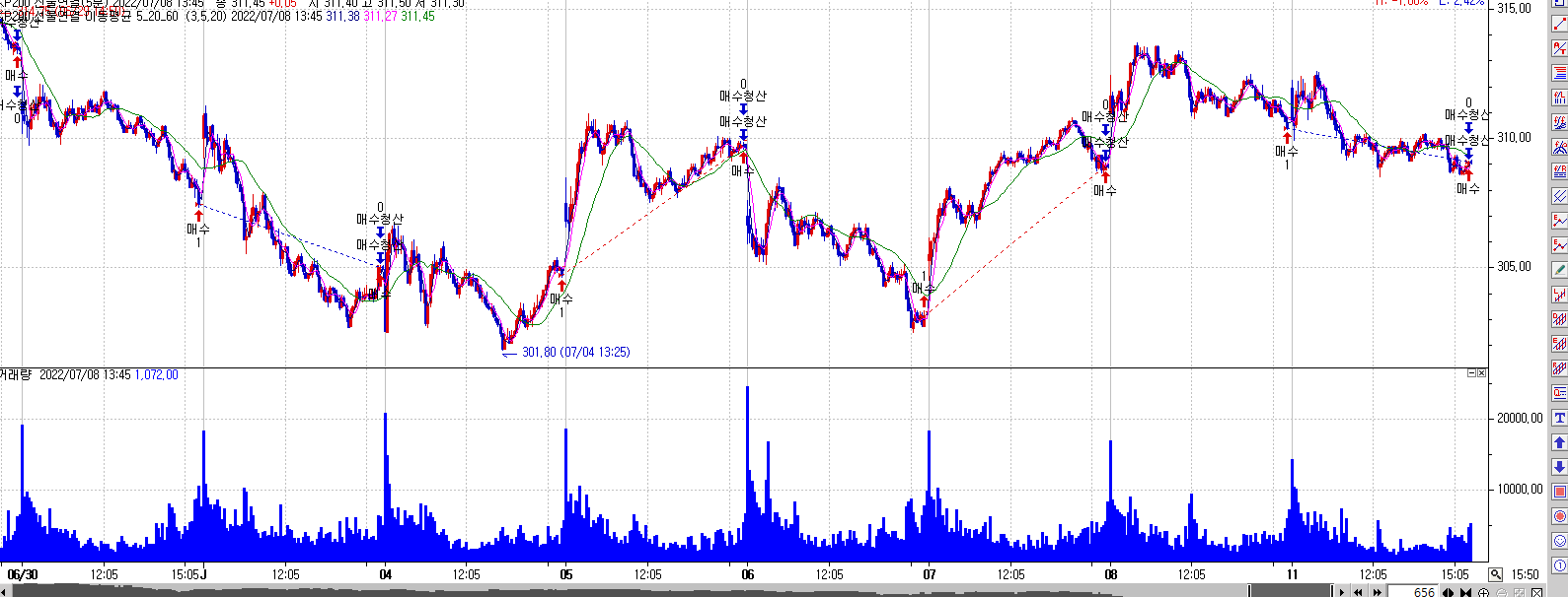 아래와 같은 수식을 했는데 하루는 제대로 진행되고, 하루는 매수하자마자 청산이 되네요..
