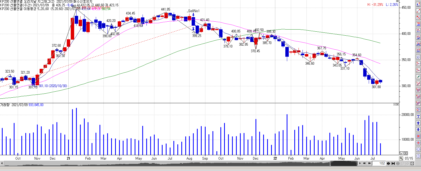 안녕하세요 개발자님. 첨부된 사진은 예전에 개발자님께서 작성해주신 지그재그 차트입니다. 주봉에 적용되었고, length(기간) 은 2 입니다.
