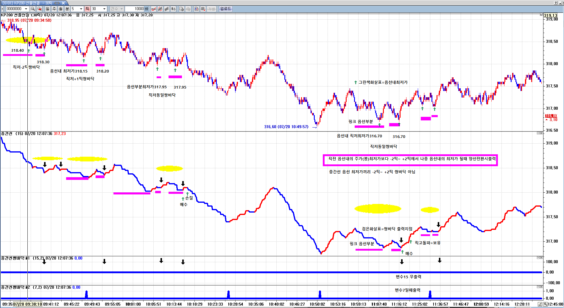 30틱 차트에서 변수를 15 그대로 하면 거의 신호가 없고 알람 신호 변수만 7로 바꾸면 빠른만큼 쓸모가 없습니다.
