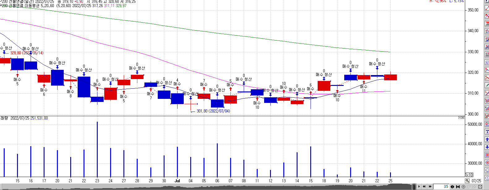 말씀하신 수식으로는 그림과 같이 '매수 후 하루 다음에 매수청산 >> 매수청산 후 하루 다음에 매수' 와 같은 과정이 반복되는데, 혹시 매수 후 매수청산 다음에 같은 영업일 종가에 매수가 진행되고 그 다음 날 또 종가에 매수청산과 동시에 매수가 이루어지는 방식의 반복은 가능할지 여쭈어봅니다