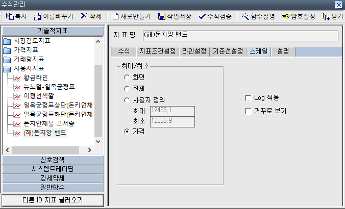지표속성화면의 Y축표시에서 가격으로 설정하고 식작성 완료 후 차트에 적용하시면 됩니다.