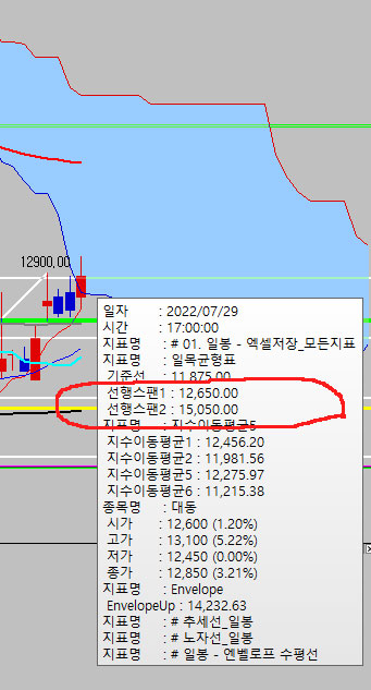 선행스팬1과 선행스팬2는 현재봉에 과거 25개봉전 값이 오게 됩니다.