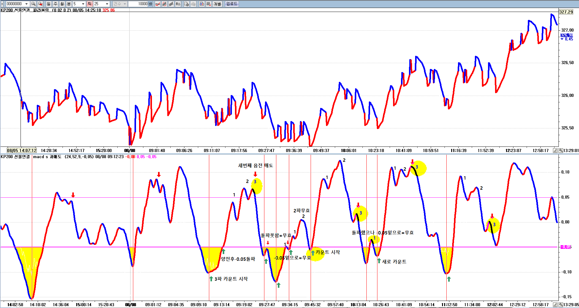 -0.05 라인을 돌파했다 다시 -0.05 라인 밑으로 내려가거나,-0.05 라인 밑에서 돌파 못하고 등락만 하면 3파 카운트 무효. 돌파하면 새로 카운트 시작.곧 -0.05 라인 상향 돌파후 세번째 음전에 매도진입(2파면 무효).