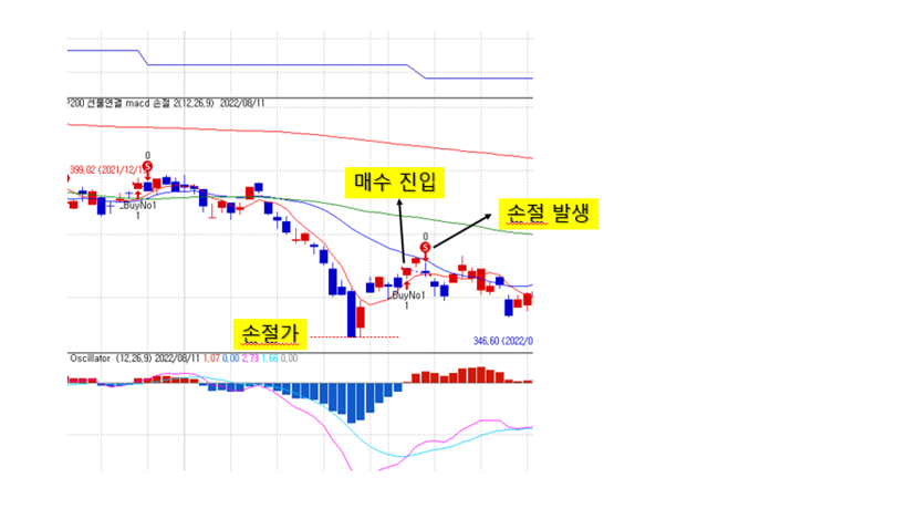 첨부그림 보시면, 매수진입 후에 손절선보다 한참 위에서 손절신호가 발생합니다.