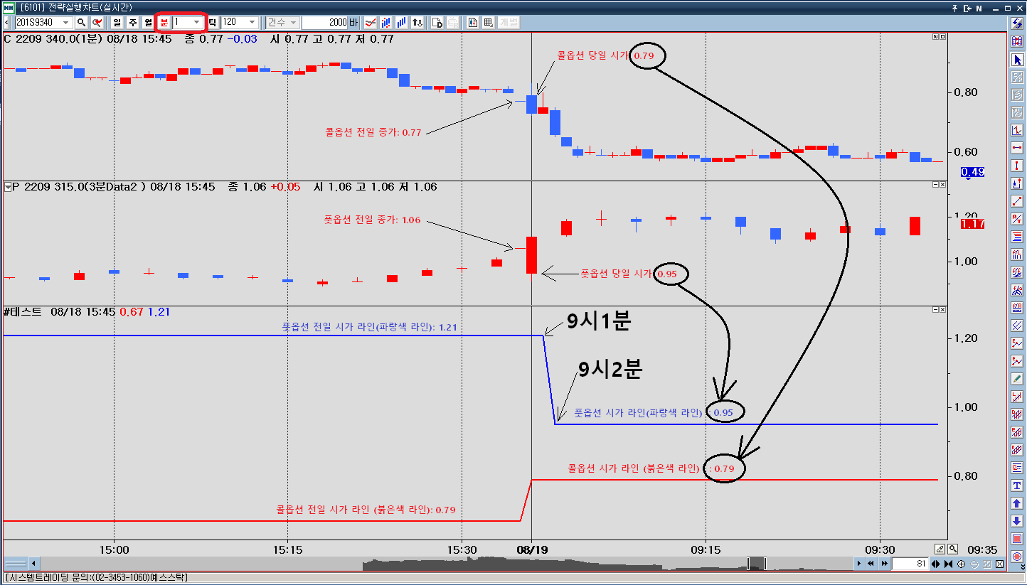 풋옵션의 경우에는 9시1분까지 당일시가가 아닌 전일시가(=1.21)가 출력되고 9시2분 이후부터 당일시가(=0.95)가 출력됩니다.