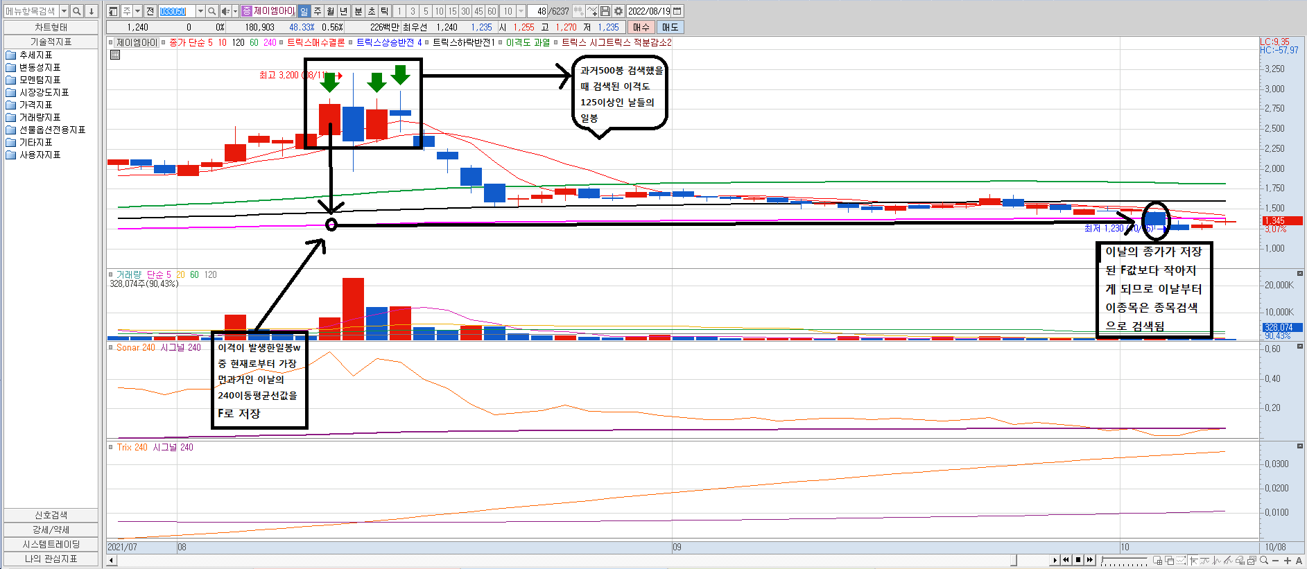 만일 오늘 8월22일의 종가(C)가 저장된 6월20일의 240이동평균성값 (F)보다