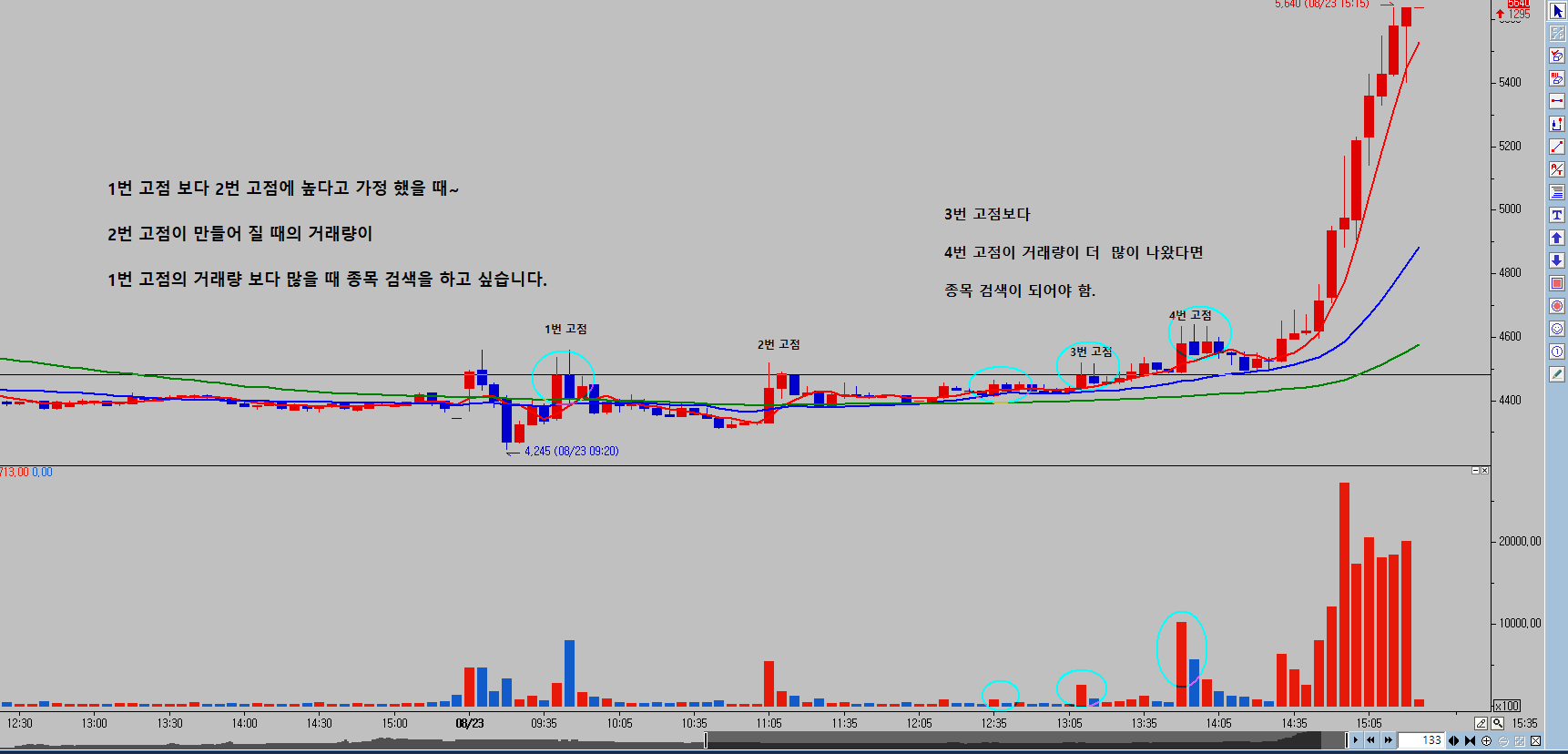 1번 고점을 넘었을때 (2번 고점) 의 거래량