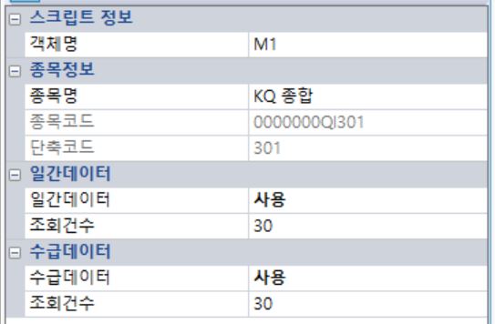 M1 종목객체에 KQ종합을 연결하고 일간데이터 사용 조회건수 30으로 설정했습니다.