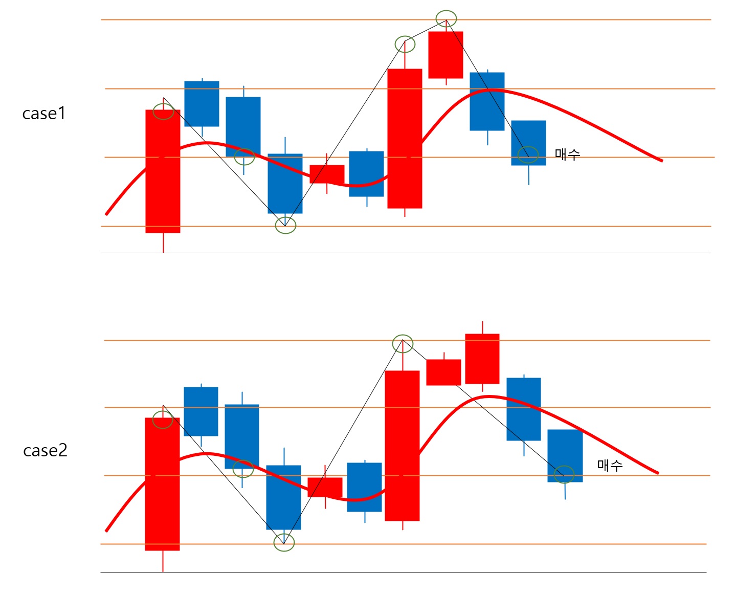 기준3. 2번 후 강하게 5일선 돌파하거나 5일선 위에 올라온 후 강하게 상승. 이 때 당일 고가를 기준가2, 기준 2의 최저가(5일선 밑에서 최저가)를 기준가1로 삼음.