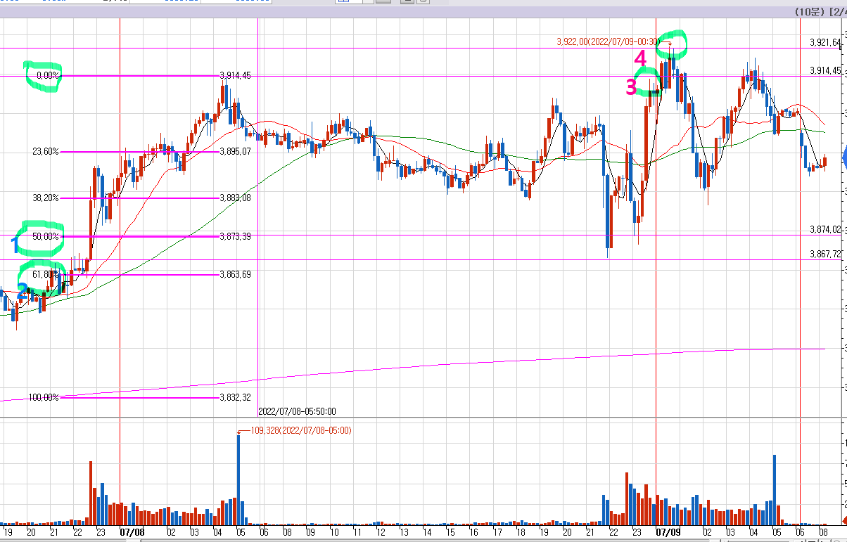 그래프처럼 피보나치 전일 1 ,2 번 매수후 당일 3 ,4 번 청산의 수식어 부탁드립니다