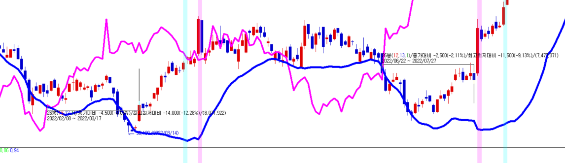 현재봉 종가가 25개봉전 볼밴값을 돌파하면 현재봉에 수직선이 표시되게 되어 있습니다.