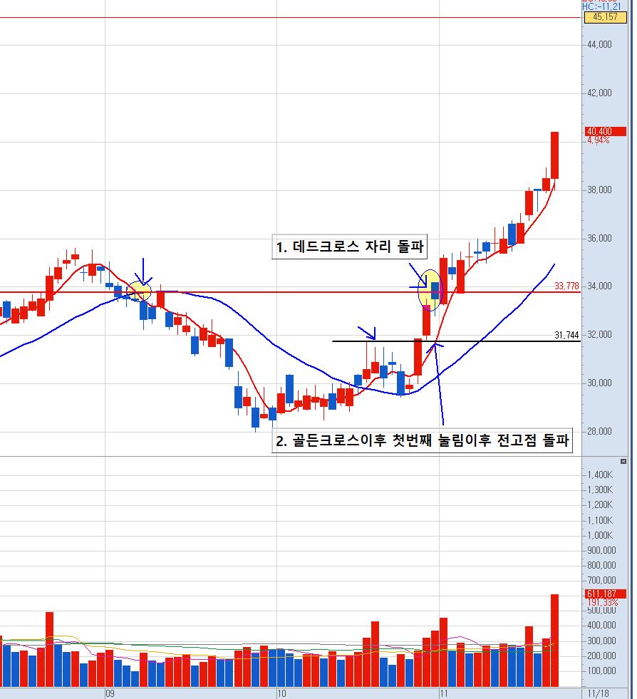 1.5-20일 데드크로스 이후 5-20일 골든크로스이후(5-20일 정배열) 전 데드크로스 자리를 돌파하는 첫번째 신호의 검색식.