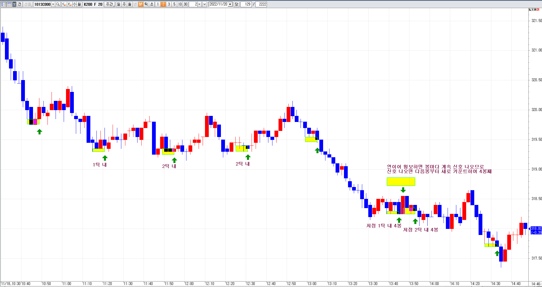 > 1.첨부한 그림같이 0.1p 내에 저가가 4개봉 형성되면 매수,다음 봉에 매수청산.