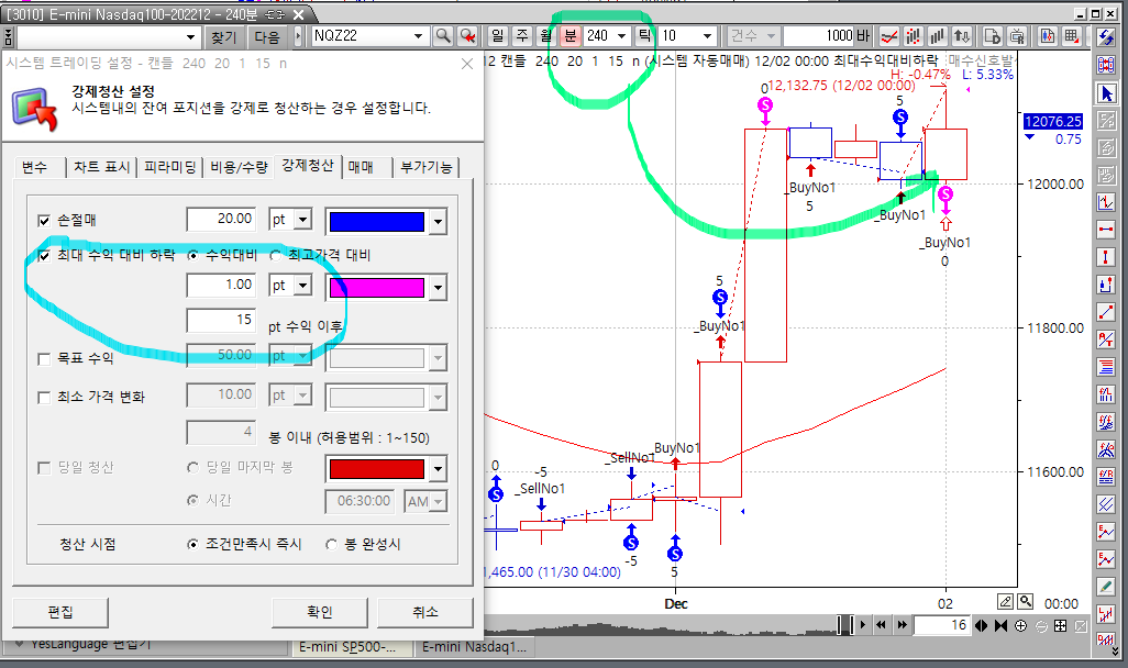 강제청산 설정에서 최대 수익대비 하락설정을 하게 되면 익절의 폭이 적게 나와서
