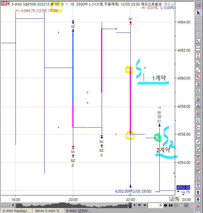 s1, 1계약 매도 진입신호후 60봉완성시 익절인 40틱에 오지않아서 청산이 안되고