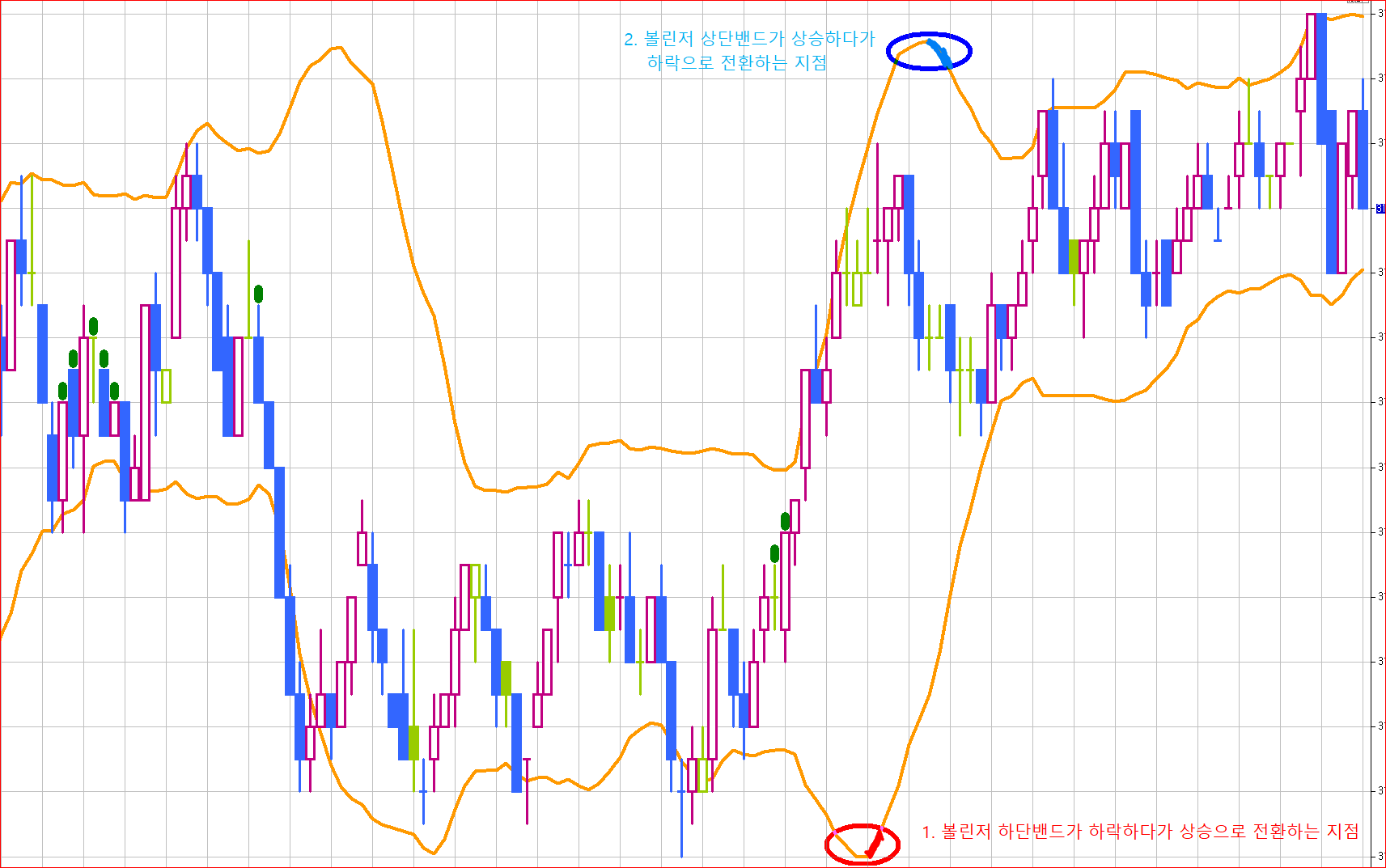 1. 볼린저 밴드 하단이 계속 하락하다가 상승으로 꺾여 올라가는 곳(해당지점만)의 하단밴드