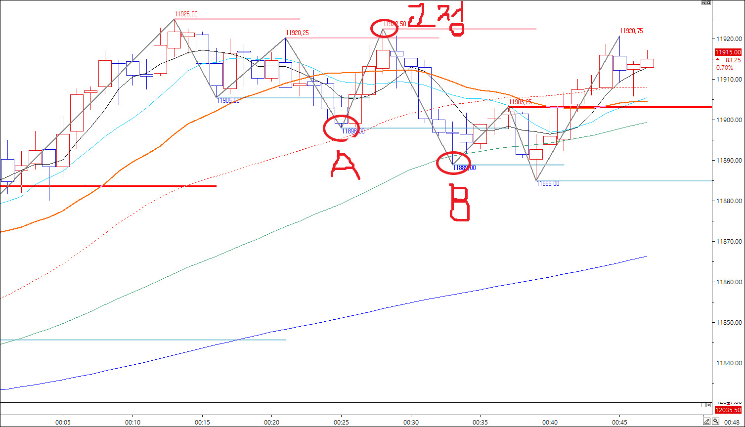 1.A 와 B 사이에 캔들중 최고가를 pinkline 으로 리턴
