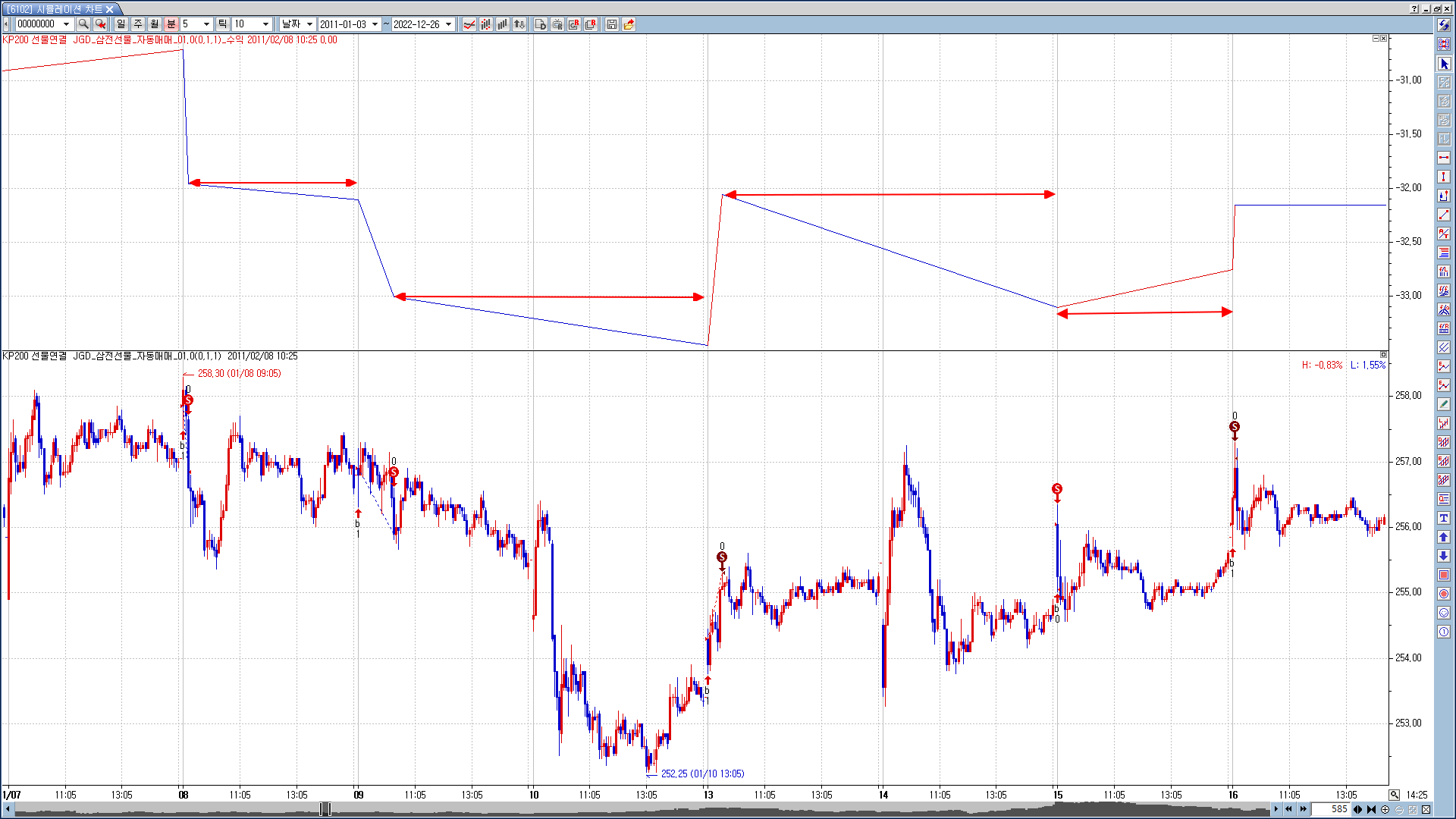 테스트용으로 시가 상승 출발시 바로 진입하고 당일 내 지정손익 청산하는 시스템 수식을 이하와 같이 작성하였습니다.