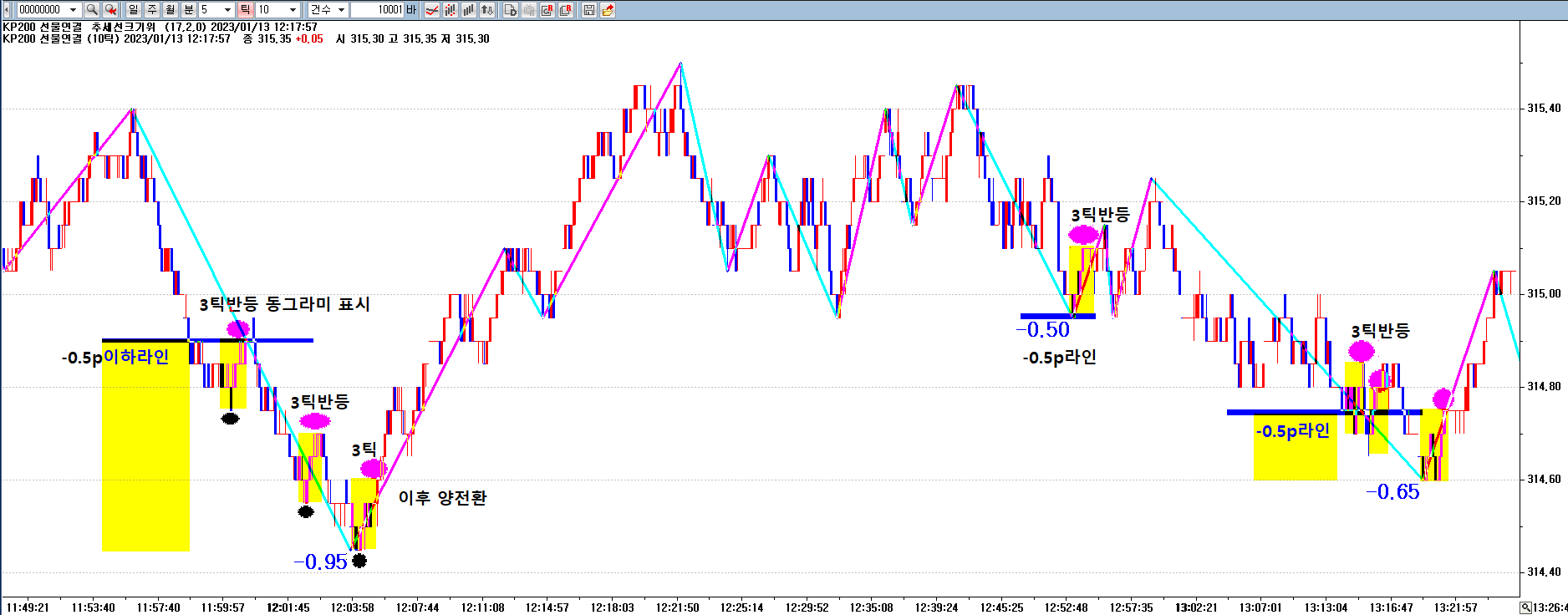 3틱 반등 첫 봉 하나가 5틱 정도까지 급등하여 장대봉이면 표시, 첫 3틱 도달봉 다음 3틱 이상 봉은 무표시. 즉 반등 3틱 도달 첫 봉에 크기 무관하게 동그라미 표시.