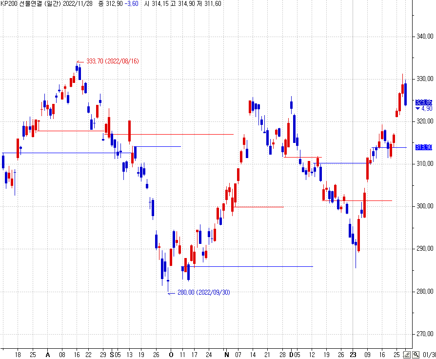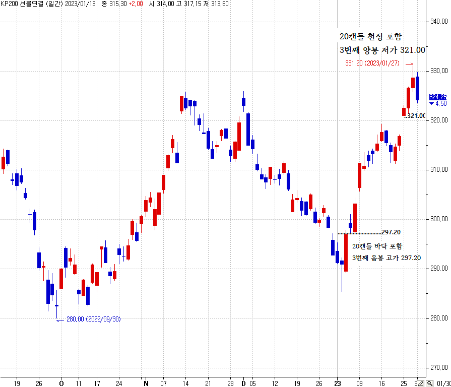 > 현재 캔들 고가가 20캔들 고가일때 천정 포함 3번째 양봉 저가를 표시한다