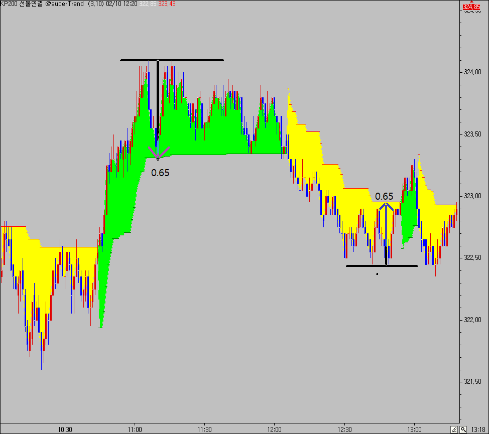 이해를 돕고져 참고 파일처럼 고점에서 0.65 하락, 또는 저점에서 0.65 상승 하여 완성봉이 되면 참고 파일 처럼 나타나는 수식을 희망합니다!