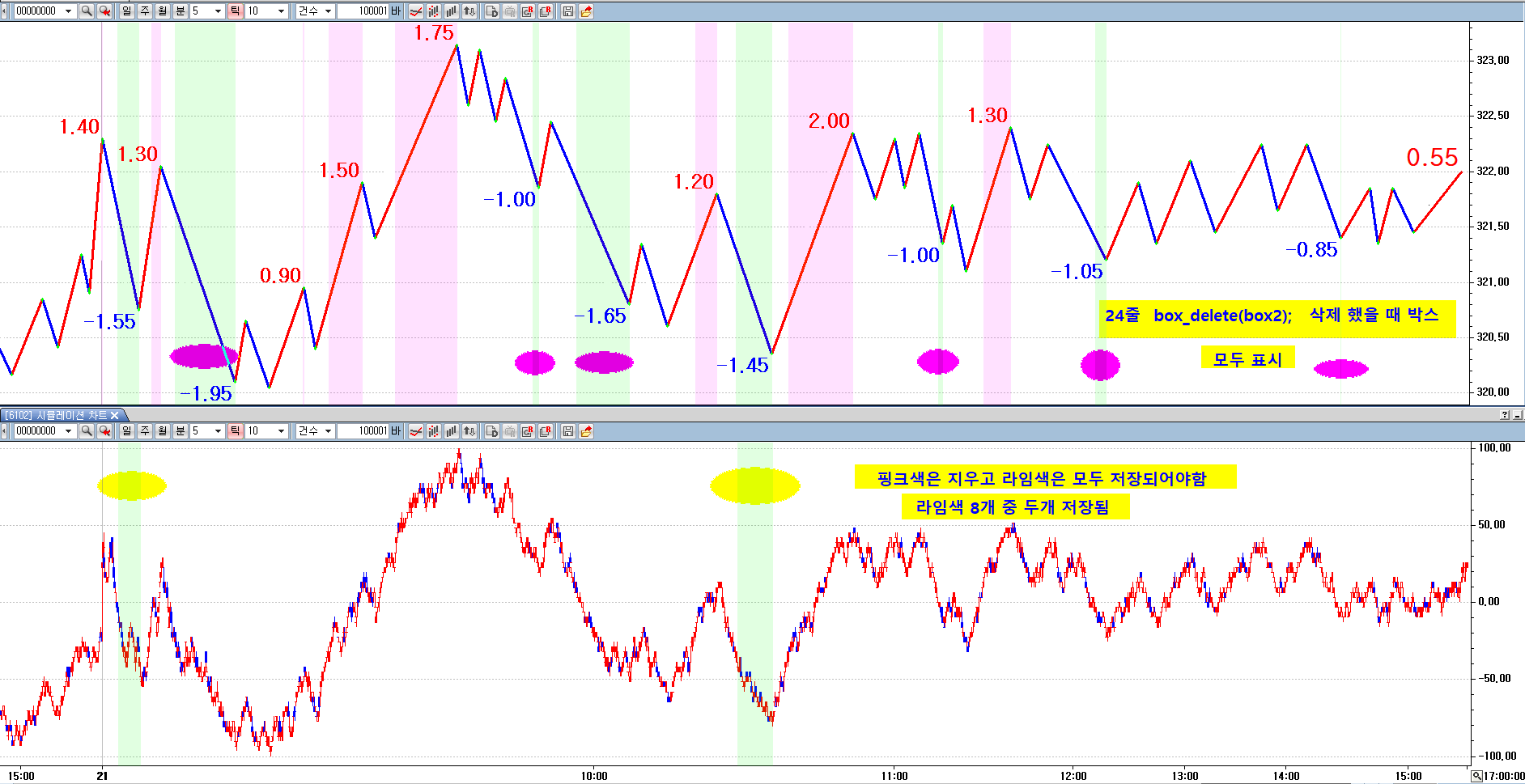 박스 표시 크기 양호하고, 상승추세선 박스 음전환시 삭제도 양호합니다.