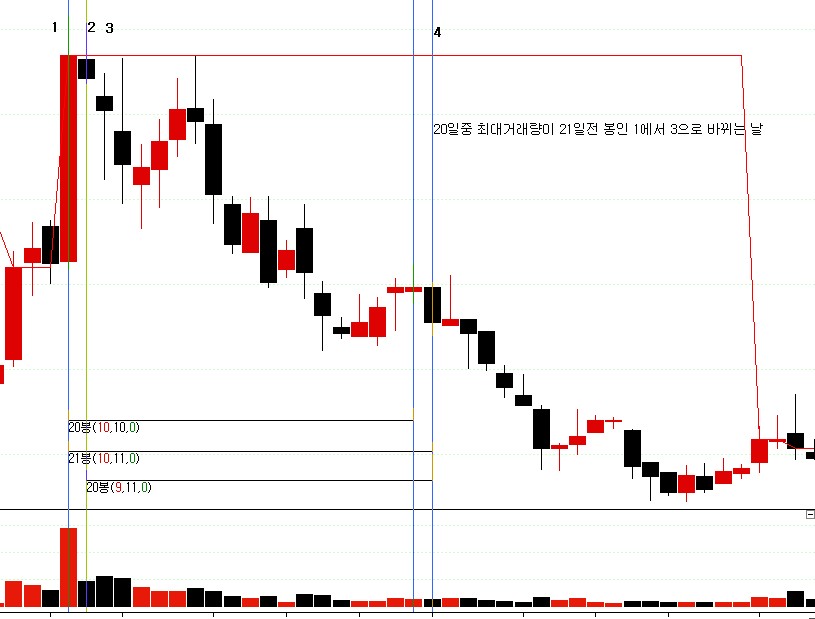 현재 지점에서 20일 최대 거래량봉을 찾고 해당봉의 종가를 그리는 내용이면