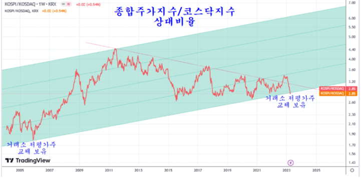 코스닥 대비 코스피의 상대비율을 아래 그림과 같이 지표로 나타내고 싶습니다 ^^